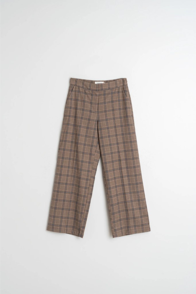 Materiál: látka s tartanovým vzorom vyrobená z recyklovaných vlákien — 64 % recyklovaný polyester, 32 % viskóza, 4 % elastan.